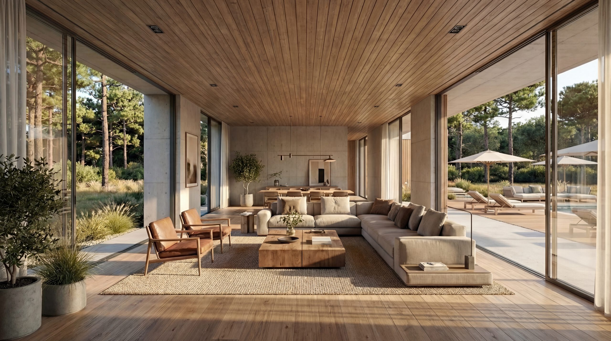 The architectural massing is defined by two distinct, intersecting volumes that respond to the site’s topography and vegetation. The upper level—a substantial exposed concrete prism—cantilevers over the ground floor, creating deep shadows that protect the interiors from the intense Madrilenian sun while forming sheltered porches for year-round outdoor use. The lower volume is wrapped in warm, vertical timber cladding, establishing a tactile rhythm that echoes the dense verticality of the native pine trees, grounding the home visually within the plot.